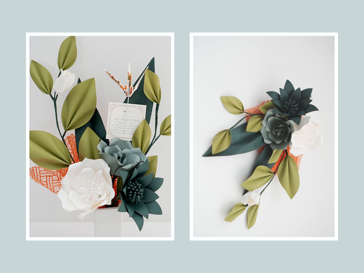 一輪一輪を花職人が高級紙から咲かせたSuperFlowerに折り鶴を添えることで、 「紙と人の手から生まれたアート」であることを直感的に伝えるデザインに。