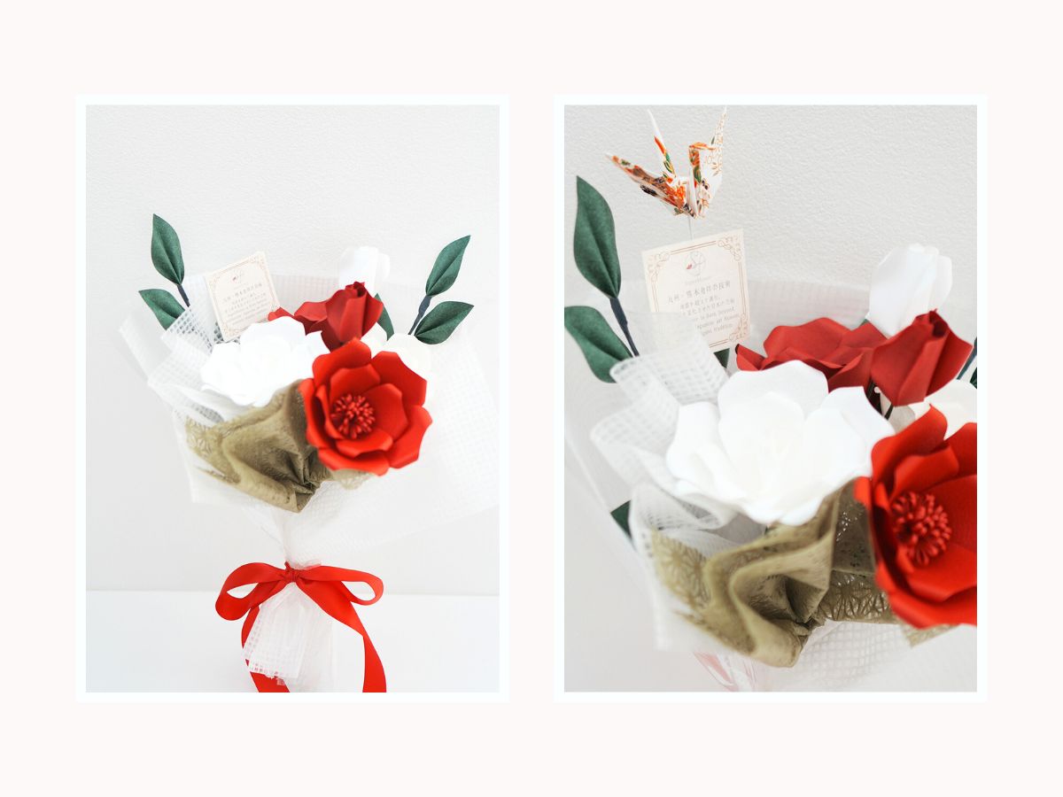 その体験を受けて、2026年のギフトフラワーシリーズでは平和と祝福を象徴する折り鶴をあしらっています。