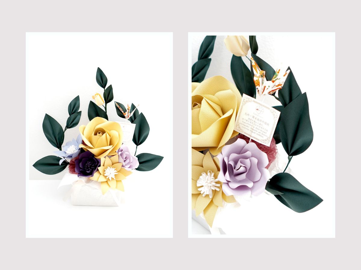 その体験を受けて、2026年のギフトフラワーシリーズでは平和と祝福を象徴する折り鶴をあしらっています。